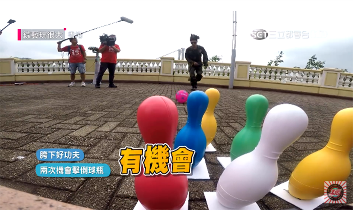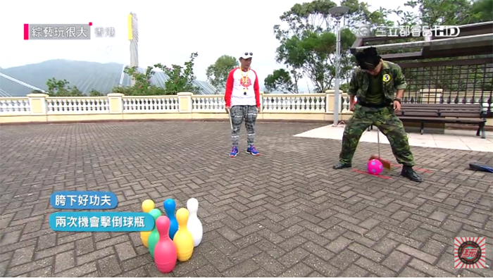 其中,小鬼和KID打扮成《超級學校霸王》中的「掃把頭老師」,要挑戰把掃把綁在腰上,靠著腰部的力量推出球,把保齡球瓶打倒。起初每一個保齡球瓶底下都有用紙板固定,距離選手大約有4~5個步伐的距離,但兩人連連挑戰失敗。