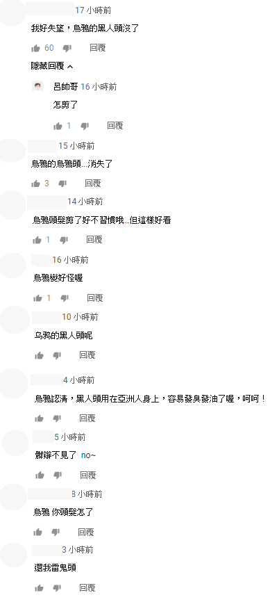 影片播出之後,許多網友紛紛留言:「我好失望,烏鴉的黑人頭沒了」、「烏鴉的烏鴉頭...消失了」、「烏鴉頭髮剪了好不習慣哦…但這樣好看」、「烏鴉認清,黑人頭用在亞洲人身上,容易發臭發油了喔,呵呵!」、「髒辮不見了 no~」。