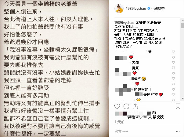 邵雨薇回頭看離開的爺爺,心裡卻一直很難受,「到底人能有多無助,無助時又有誰能真正的幫到忙伸出援手,我頓時好後悔沒一樣事情有幫上忙,誰都不希望自己老了會變成這這樣啊…」這件事讓她徹夜難眠,遲遲無法入睡,直說下次絕對不要讓自己有這種後悔的感覺,「什麼忙都好,一定要幫上」,也呼籲粉絲們下次要勇敢熱心,盡自己所能地幫忙和關懷。