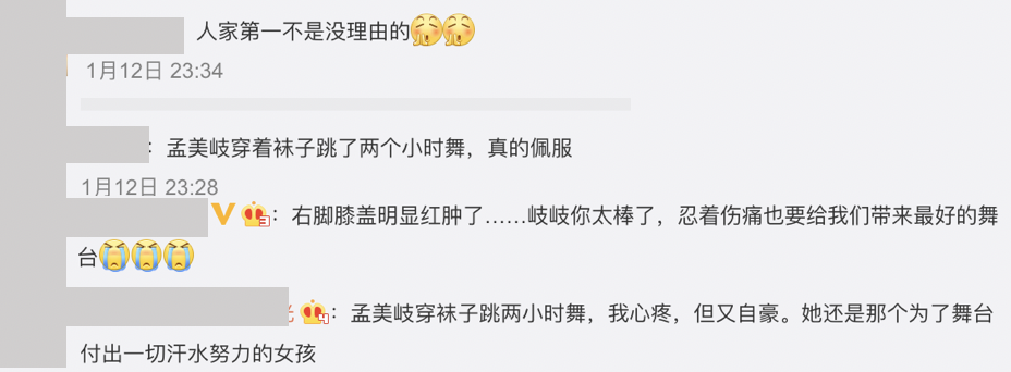 網友發現孟美岐負傷上陣後,也紛紛留言說道:「人家第一不是沒理由的」、「孟美岐穿著襪子跳了兩個小時舞,真的佩服」、「孟美岐穿襪子跳兩小時舞,我心疼,但又自豪。她還是那個為了舞台付出一切汗水努力的女孩」、「右腳膝蓋明顯紅腫了……岐岐你太棒了,忍著傷痛也要給我們帶來最好的舞台」,讓網友非常心疼。