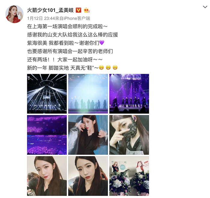 從大陸女團選秀節目《創造101》中出道的「火箭少女101」,團體限定兩年的活動期間,預計於2020年6月23日合約到期,然而出道後討論度也不斷增加,去年8月時推出首張專輯《撞》,更在今年14日時推出第二張專輯《橫衝直撞下一站》。 12號時,火箭少女舉辦上海首場演唱會,團員們也非常賣力的載歌載舞,為粉絲帶來精彩的表演。
