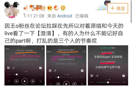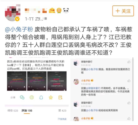 難得三人合體的TFboys,本月11日時出席2018微博之夜的盛典,除了獲得獎項之外,三人也擔任表演嘉賓,合體演唱《喜歡你》,但就有粉絲發現在演出時王源搶了王俊凱的歌詞,也因為此原因導致整首歌的節奏被打亂,王俊凱的粉絲也開始將這些證據放上微博,此舉也引起王源的粉絲回擊,宣稱其實是因為王俊凱跑掉了,王源想要幫王俊凱救場才會搶了詞,兩人的粉絲們也開始在微博上互罵。