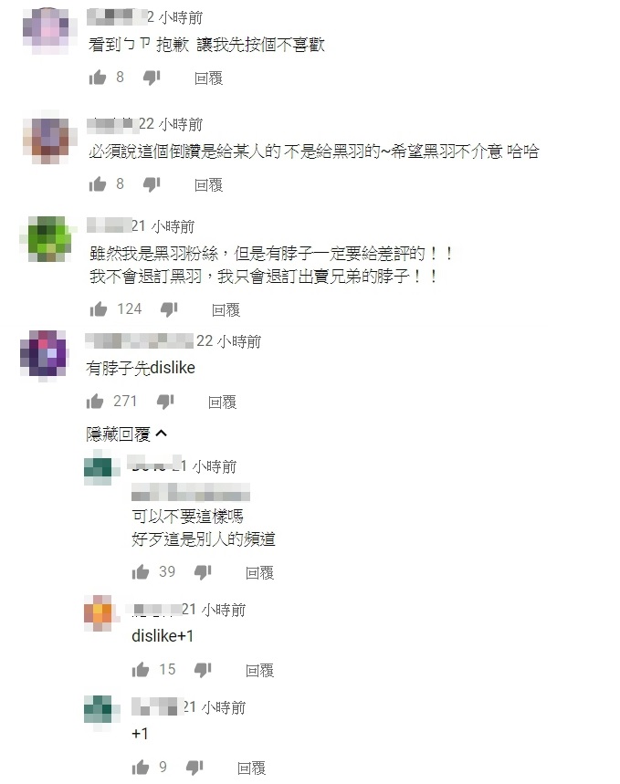 另外脖子作客黑羽的頻道,引起粉絲諸多抗議:「看到ㄅㄗ 抱歉 讓我先按個不喜歡」、「必須說這個倒讚 是給某人的 不是給黑羽的 希望黑羽不介意 哈哈」、「雖然我是黑羽粉絲,但是有脖子一定要給差評的!!我不會退訂黑羽,我只會退訂出賣兄弟的脖子!!」、「有脖子先dislike」、「可以不要這樣嗎 好歹這是別人的頻道 」、「dislike+1」、「+1」。