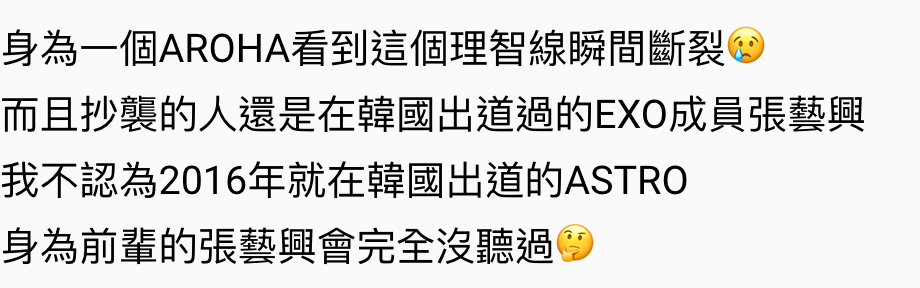 網友也紛紛在文章下方留言:「雖然我是愛麗,但是我看到的時候很懷疑想說張藝興什麼時候跟Astro有合作還是認識了,還點進去看了好幾次發現人根本不是,不得不說團名跟Logo真的很像,現在整個問號???」、「傻眼 根本一模一樣==」、「抄襲節目也上 歌曲也抄襲,現在還抄襲別家的團名logo」、「所以說張藝興要退出EXO了沒,拜託趕快退」