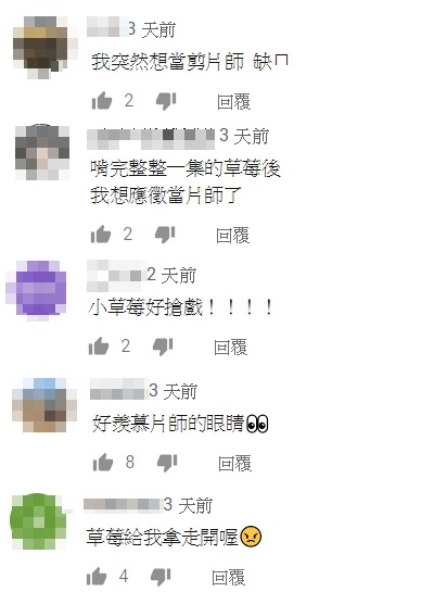 影片結束後,網友們對於草莓馬賽克,紛紛表達意見:「我突然想當剪片師 缺ㄇ」、「啃完整整一集草莓後 我想應徵當片師了」、「小草莓好搶戲!!!」、「好羨慕片師的眼睛」、「草莓給我拿走開喔」。