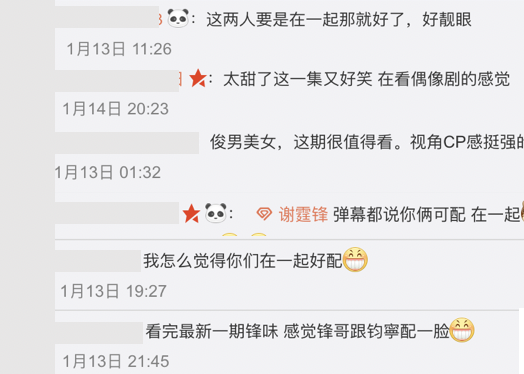看見兩人在這集節目中自然聊天以及有愛互動的模樣後,紛紛留言表示:「感覺鋒哥和鈞甯配一臉」、「俊男美女,這期很值得看,視覺CP感挺強的」、「太甜了這一集又好笑,在看偶像劇的感覺」、「這兩人要是在一起就好了」、「彈幕都說你倆可配,在一起」、「我怎麼覺得你們在一起好配」