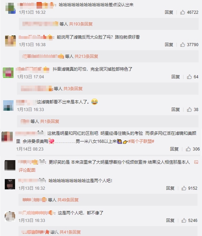 不過從別桌網友分享的影片中可以看到,在一般鏡頭中的佘詩曼顯得正常許多,依舊散發著美麗又端莊的氣質,讓網友直呼:「網紅濾鏡也太誇張了」、「差點沒認出來」、「用了濾鏡反而大眾臉了」、「這是兩個人吧,都不像了」、「完全民滅掉臉部特色了」、「更好笑的是,本來店裡來了大明星想拍個視頻做宣傳,結果沒人相信那是本人」。