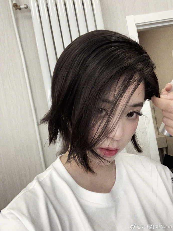 歐陽娜娜從小在鏡頭前一直都是長髮的模樣,不過日前她突然曬出一連串的自拍,髮型卻變成耳下3公分的激短髮,甚至連肩膀也碰不到,瀏海也變成大旁分,還有部分的髮絲落在臉上,看上去多了幾分成熟的韻味。她用完造型噴霧,把鏡頭當作鏡子調整髮型,烏黑的個性短髮襯托出她雪白的肌膚,鵝蛋臉更加明顯,帥氣的模樣和過去甜美女孩的形象有很大的差別。