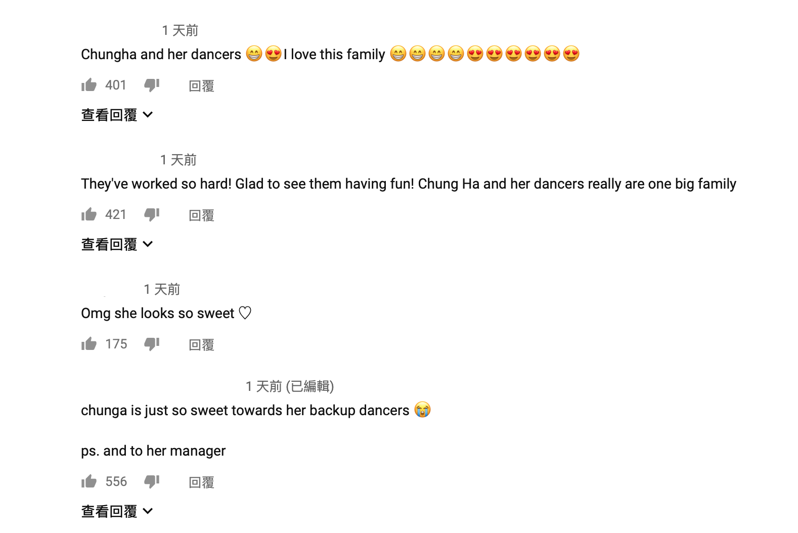 看到請夏跟舞群滿滿的愛,粉絲紛紛表示「我愛這個『家庭』」、「很高興看到他們這麼開心!請夏跟她的舞群真的是一個『大家庭』!」、「請夏對她的舞群太甜蜜了!」。