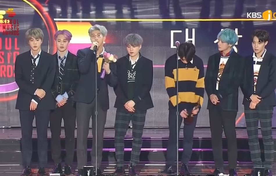 15日,防彈少年團參與第28屆「首爾歌謠大賞」,當天在短短10分鐘的演出過後,緊接著頒發最大獎「大賞」,就成功連莊奪下獎項殊榮。不過由於剛表演完,成員興奮上台臉上的汗水都來不及擦乾,由隊長RM接下獎盃後就發表感言,表示能連兩年獲獎都要感謝「阿米」(粉絲)的支持,接著也謙虛說到「雖然不知道大家會不會相信,但是我們防彈少年團也是大家的粉絲」,對此RM進一步解釋「大家給我們的故事、能量和聲音,都成為我們創作的靈感,也是我們表演的能量來源。」在在表示著和粉絲密不可分的關係。