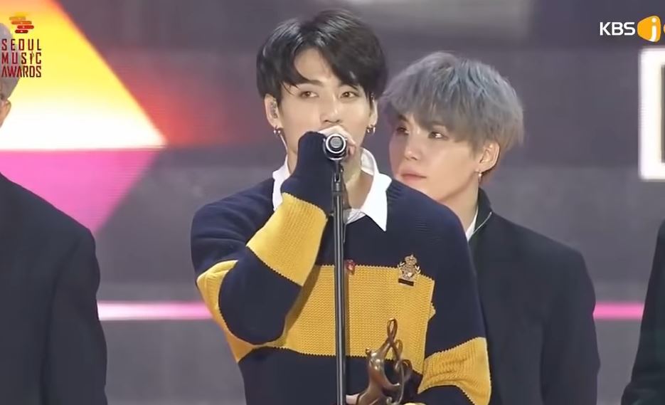 接著由團內年紀最小卻總是賣力演出的成員柾國發表感言,因為隊長RM一直是柾國相當崇拜的前輩,緊接著發言的他先說到「如果沒有南俊哥(RM本名)的話,我現在可能就不是BTS了,很想感謝他。」接著也將榮譽獻給粉絲說到「如果沒有大家的話,我們是不會這麼幸福的,也可能一生都不會經歷某些事情,謝謝大家讓我擁抱這麼幸福的人生」。