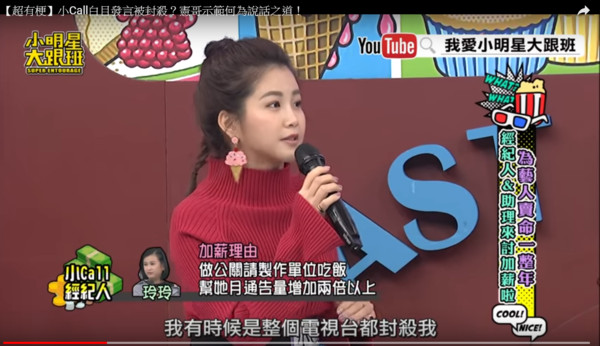 小Call在節目上透露,她因為個性直率,講話太直接,經常不知不覺就得罪人,還被誤會有大頭症,導致她損失慘重,甚至惹到某個節目,被「整個電視台」封殺,只要是該電視台的節目都不能上,讓吳宗憲聽傻眼:「小Call怎麼會被封殺,這我才覺得奇怪。」事後還是靠著經紀人玲玲辛苦做公關、請單位吃飯,才讓小Call的通告量增加兩倍,也難怪玲玲會要求加薪!