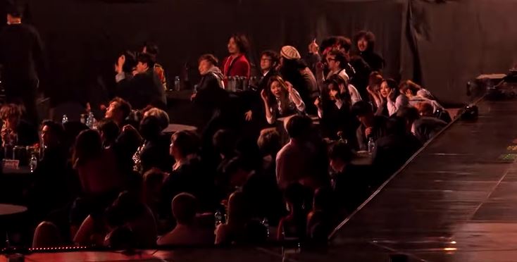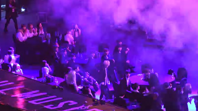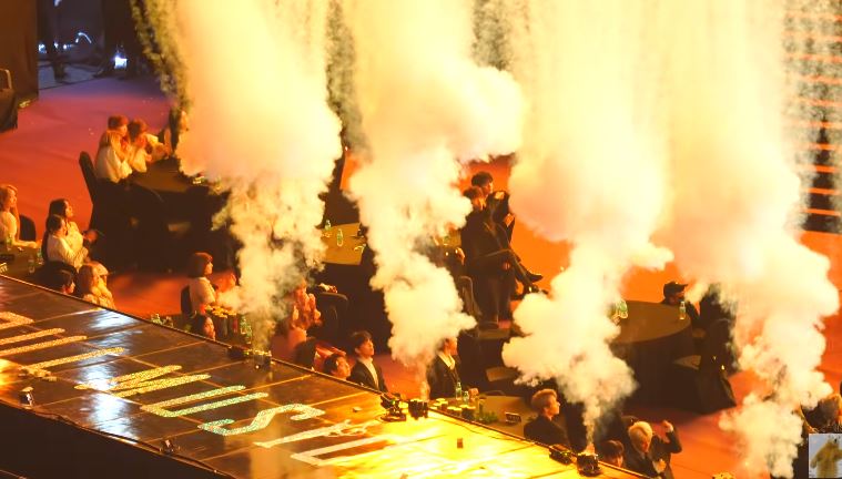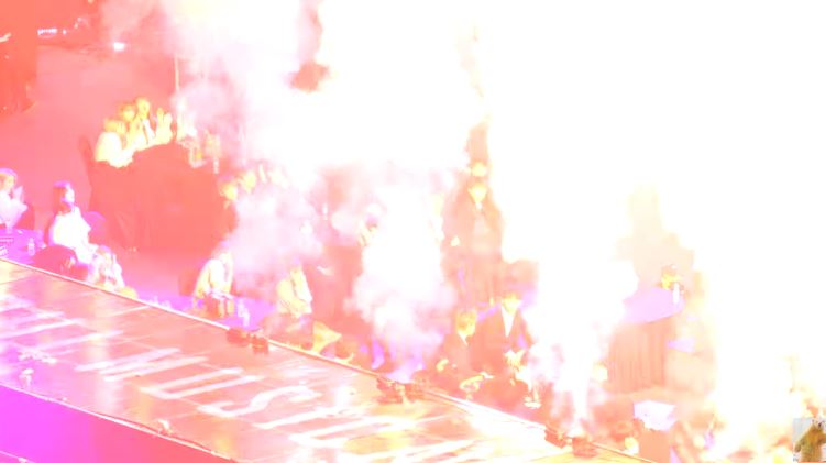畫面中,舞臺煙火突然爆裂,白煙也不斷竄到空中,坐在煙火區旁的像是TWICE和SEVENTEEN,就因為火花噴發留下來的刺鼻煙味,以及殘留的灰燼,各個忍不住從位置上離開,手也不停揮動頭髮,似乎想把頭上的灰燼給抖乾淨。