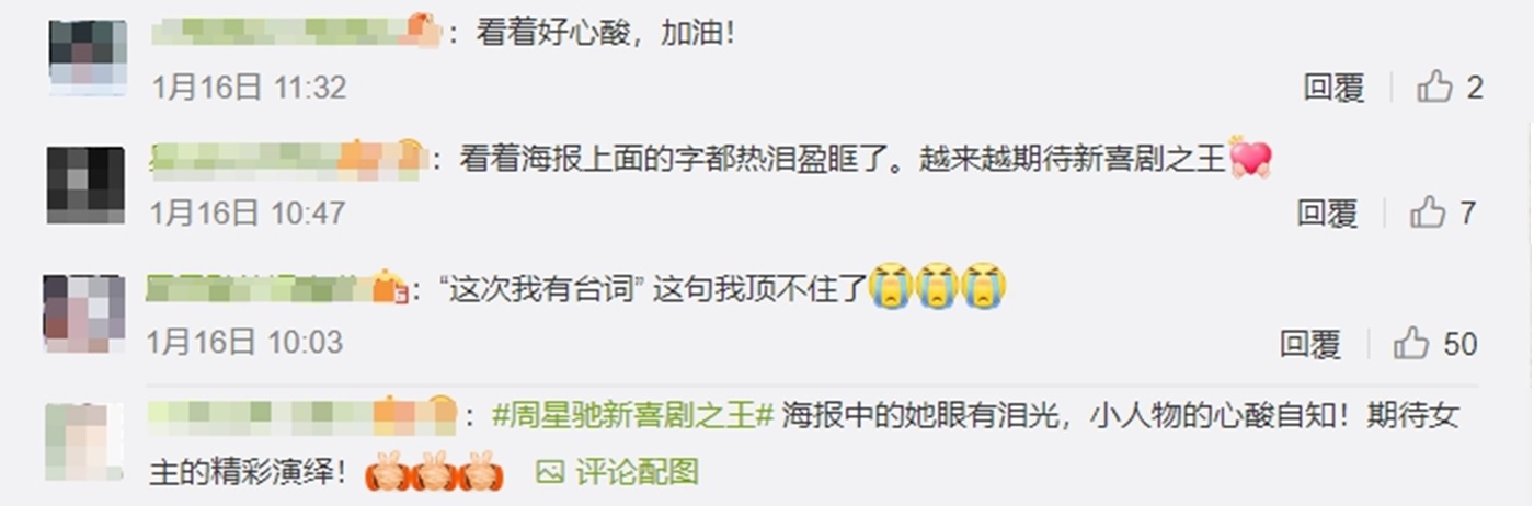 新喜劇之王官方微博釋出了電影預告片的第14天後,終於發了一張女主角的海報,並在貼文中表明女主角就是鄂靖文,解開了影迷們的強烈好奇心。只見海報中的她臉上的戲劇妝都尚未卸掉,甚至還帶著傷口,便急著打電話回家說:「媽,我挺好的,這次我有台詞...」,這句話不僅道出了小人物的辛酸,更因為貼近鄂靖文的自身經歷,讓大家更能夠真切感受演員想帶給大家的心境。此海報一出也隨即引起熱烈討論,許多粉絲看著海報便覺得鼻頭一酸,似乎很有感觸,紛紛表示:「看著好心酸,加油!」、「看著海報上面的字都熱淚盈眶了,越來越期待新喜劇之王」、「"這次我有台詞"這句我頂不住了」、「海報中的她有淚光,小人物的辛酸自知!期待女主的精采演繹!」