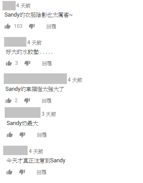 在這集的《Joeman Show》中除了毛孩們真的很可愛、很吸睛外,Sandy的身材也成了網友討論的焦點,影片中Sandy穿了淺咖啡色的緊身衣服,將其玲瓏有緻的身形顯露無遺,也讓網友們紛紛留言說「Sandy的衣服陰影也太厲害~」、「好大的水餃墊 . . . . .」、「Sandy的車頭燈太強大了」、「今天才真正注意到Sandy」。