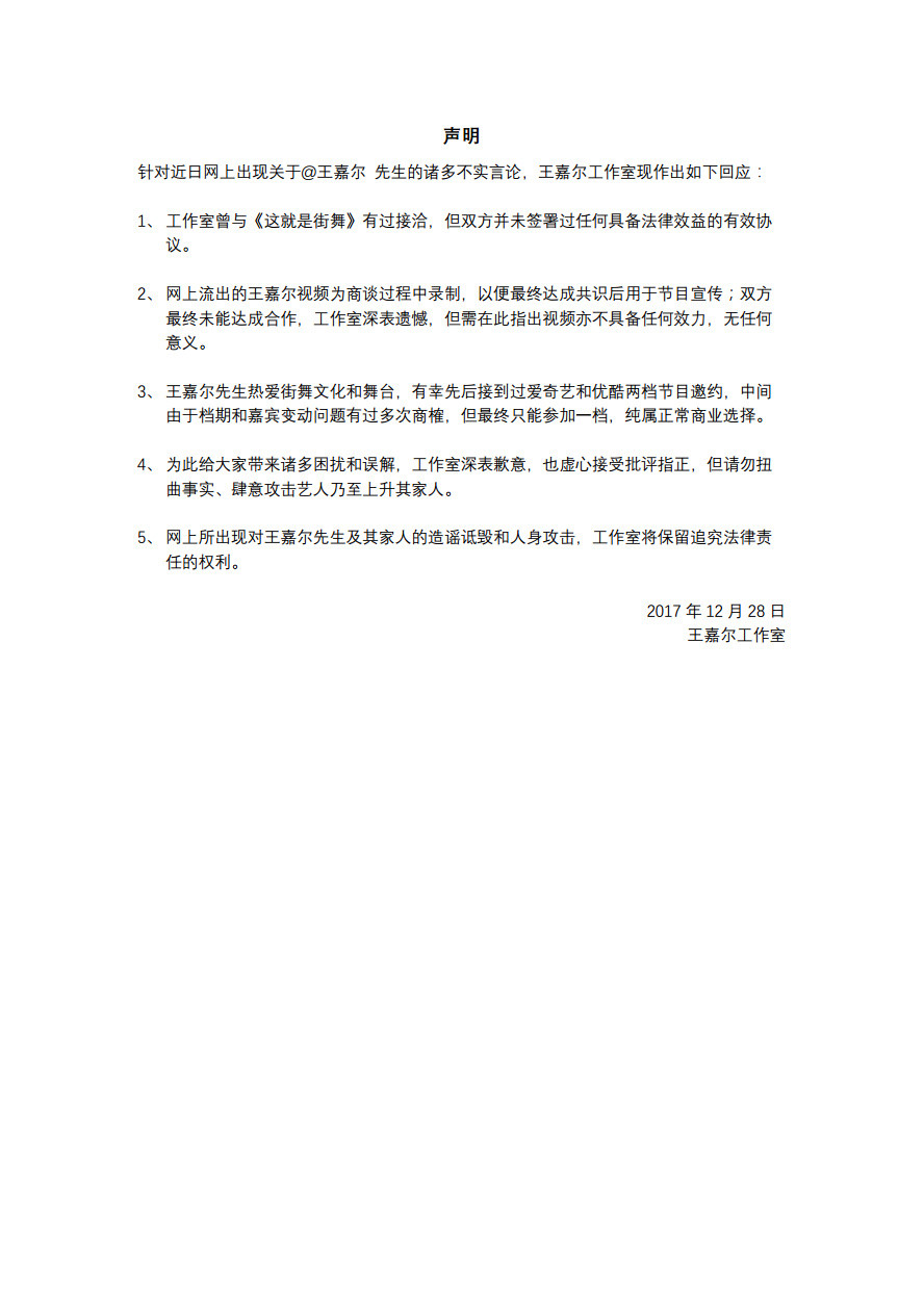 事發兩天後,王嘉爾工作室的微博才發表聲明,承認同時收到愛奇藝和優酷的邀約,並以「中間由於檔期和嘉賓變動問題有過多次商榷,但最終只能參加一檔,純屬正常營業選擇」為由,跳槽到愛奇藝的《熱血街舞團》,針對合約問題,工作室也表示「工作室曾與《這就是街舞》有過接洽,但雙方並未簽署過任何具備法律效益的有效協議」。
