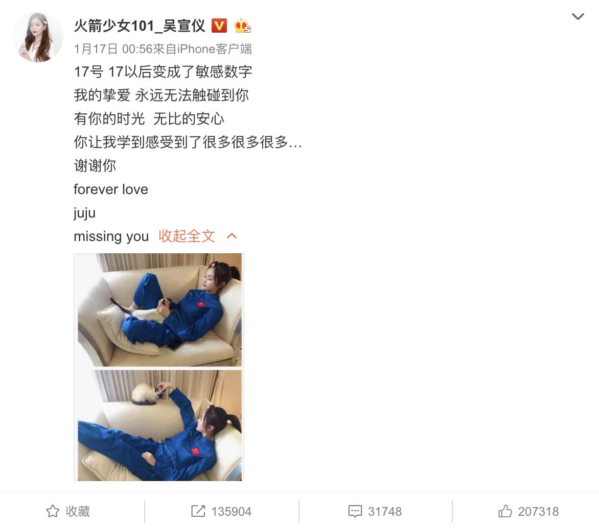 女團選秀節目《創造101》出道的「火箭少女101」從今年六月正式成軍,出道後便話題不斷,討論度更是持續延燒。出道經歷過退團風波後,火箭少女演藝事業發展也越趨穩定,過去也發行了首張專輯《撞》。而其中以第二名出道的「吳宣儀」,一直以來因甜美的外表而深受粉絲喜愛,人氣高居不下。17日時,吳宣儀發佈了一則貼文,寫下:「17號,17以後變成了敏感數字」,也湧入大批粉絲關心。