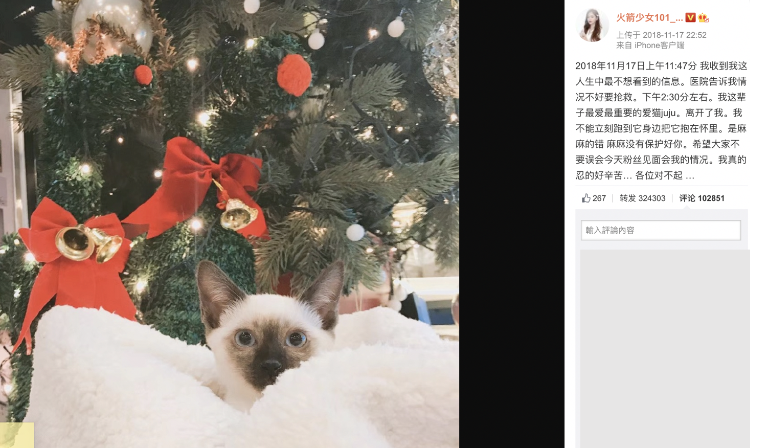 在去年11月17日時,juju過世了,吳宣儀也沈痛地寫下:「2018年11月17日上午11:47分 我收到我這人生中最不想看到的信息。醫院告訴我情況不好要搶救。下午2:30分左右。我這輩子最愛最重要的愛貓juju。離開了我。我不能立刻跑到它身邊把它抱在懷裡。是麻麻的錯 麻麻沒有保護好你。希望大家不要誤會今天粉絲見面會我的情況。我真的 忍的好辛苦… 各位對不起 … 」,因此每月的17日成了吳宣儀最難過的一天。