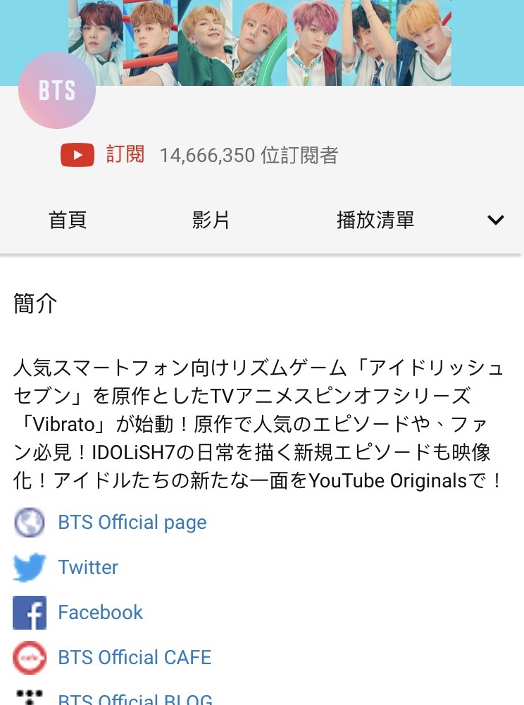 17日晚間,防彈少年團YouTube的官方頻道「Bangtan Union」疑似被日本動漫平台「IDOLiSH7」入侵,首頁中僅剩下大頭照和封面照,而原本大頭照下方應該有的名稱「Bangtan Union」字樣也莫名其妙消失,變成一個方塊格子。