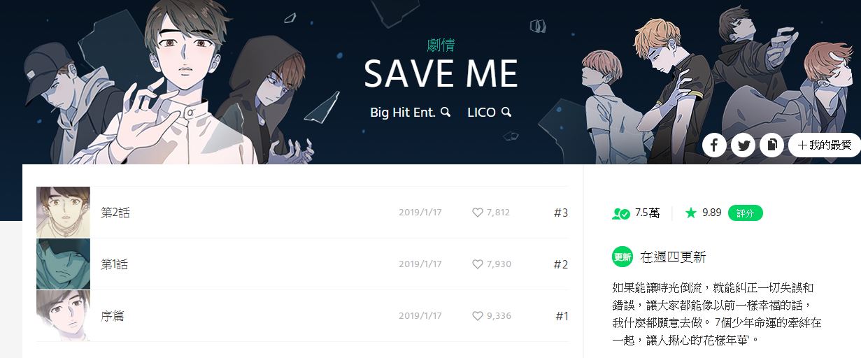 近期,防彈少年團和數位漫畫平台LINE WEBTOON合作,推出的網路漫畫《SAVE ME》,17日已經在台灣、大陸、日韓、美國等地區同步發行。漫畫內容是改編自2015年起《花樣年華》系列MV中,BU(BTS Universe,防彈少年團宇宙),並講述7位成員分道揚鑣的兩年後為背景,以Jin與朋友重新聯繫為契機,展開一段血汗淚交織的年少輕狂青春故事。