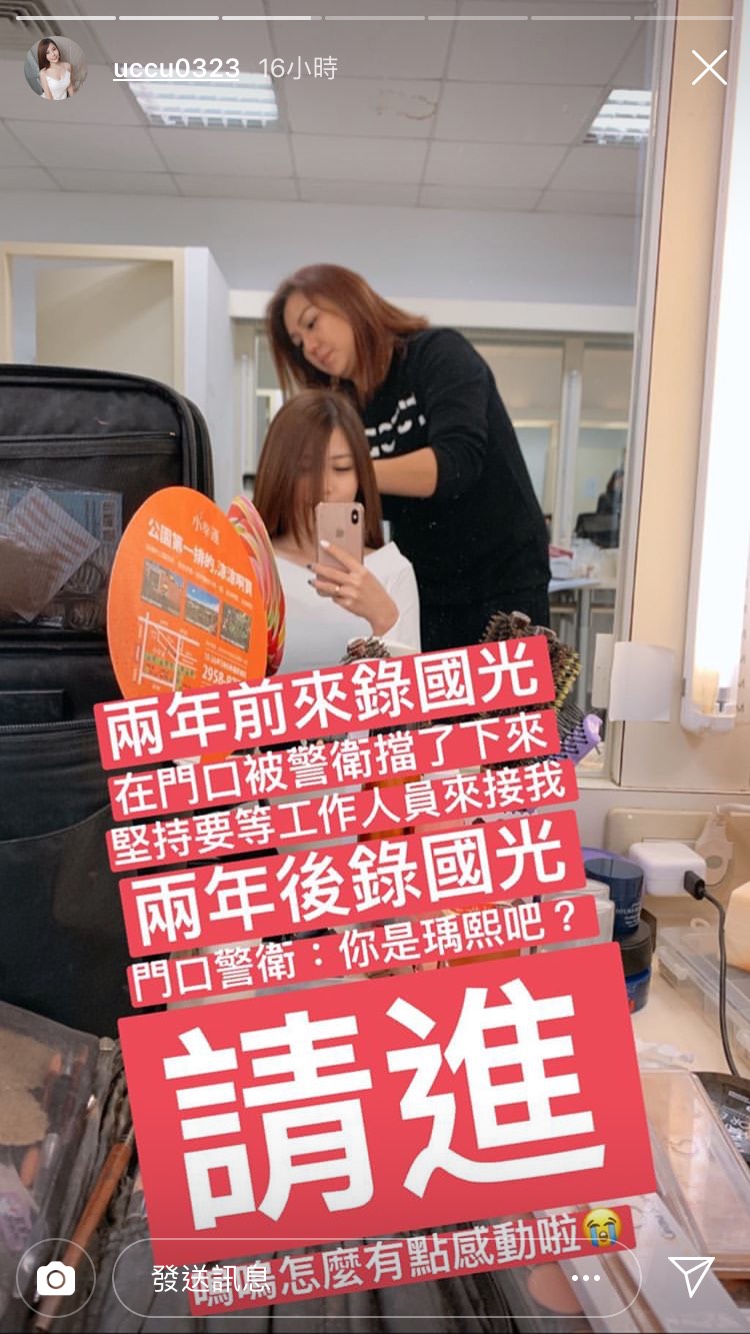 瑀熙昨(17)日在IG限時動態中發布了一張正在弄妝髮的照片,並且打上:「兩年前來錄國光,在門口被警衛擋了下來,堅持要等工作人員來接我」,表示兩年前因為知名度不夠,警衛完全不認識她,不過兩年後的現在警衛則一眼認出說道,「你是瑀熙吧?請盡」,讓瑀熙聽了直說:「嗚嗚怎麼有點感動啦」。