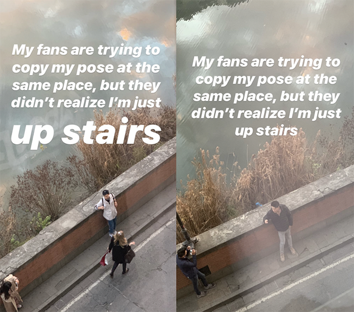 周杰倫目前正在進行《地表最強》世界巡迴演唱會,場場門票都秒殺,魅力無法擋,而他也時常在IG上發布他周遊列國的照片,在兩天前他到義大利的佛羅倫斯旅遊時,拍下一張他在街頭和景色的合照,並上傳到IG上,而一天之內就有許多粉絲爭相到相同的地方,學周杰倫的姿勢拍下照片,然而周杰倫本人就在樓梯上方,卻沒有粉絲發現。
