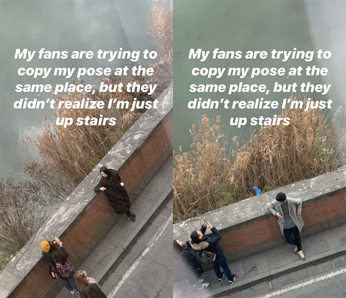 18日周杰倫在IG限時動態中發了4張照片,照片中粉絲們都學著周杰倫的姿勢拍照,但其實他本人就在樓梯上面,但卻沒有粉絲發現他,他寫下:「My fans are trying to copy my pose at the same place, but they didn’t realize I’m just up stairs」,網友看見後也紛紛留言:「周杰倫快來偷拍我」、「杰倫小公主好調皮啊 粉絲好幸福 被杰倫注視了 哈哈哈」、「哈哈哈哈哈哈我倫真的越大越調皮了」、「實名羨慕這位粉絲」