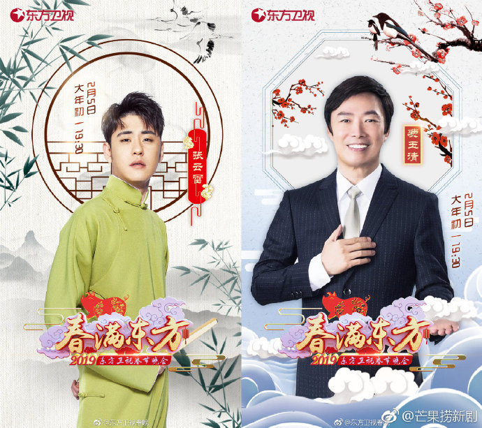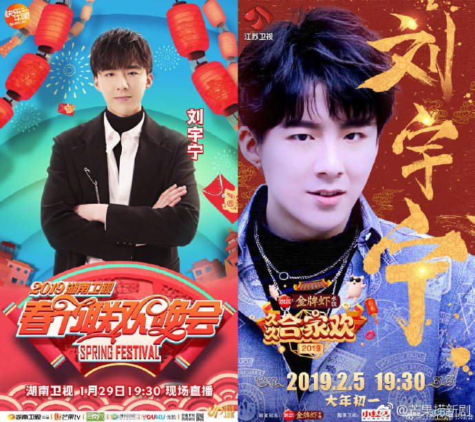 根據知名微博博主《芒果撈新劇》情報指出,目前已有五家電視台宣布一些春晚的名單,包括:湖南衛視、江蘇衛視、東方衛視、北京電視台與安徽衛視,湖南的春晚嘉賓目前邀請到參加《歌手2019》的樂團摩登兄弟「劉宇寧」,以及知名歌手「李宇春」等人;江蘇的春晚邀請到知名男歌手「胡夏」、「汪蘇瀧」,以及參加《明日之子》獲得總冠軍的「毛不易」。