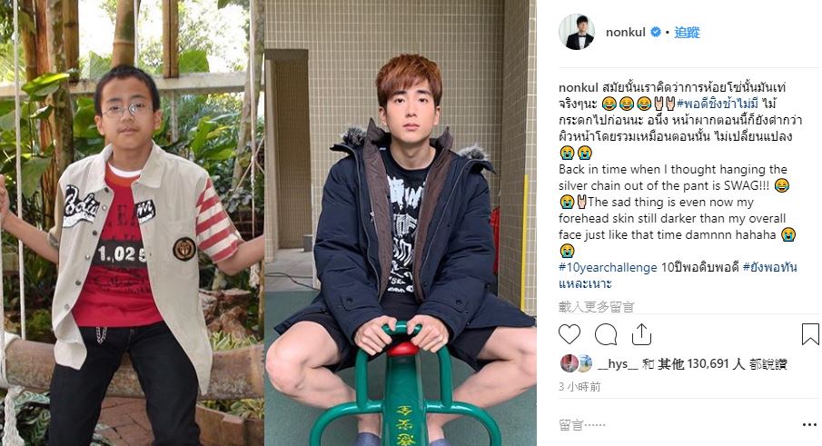 19日,查農時隔一周終於再次更新IG,更搭上10年對比照熱潮,照片左邊是10年前的查農,當時的他坐在木頭鞦韆上,整體造型樸素,不僅理了好整理的平頭,也帶著銀框眼鏡,不過查農也表示「那時候還覺得在褲子上掛銀鍊很潮」,並附上表情符號,表達回想起過去的流行感到相當有趣。