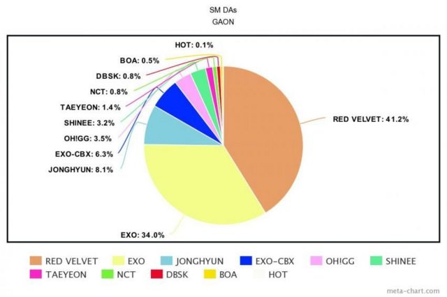 第二名則是有韓國造星廠之稱的「SM Entertainment」,SM娛樂公司目前在音源銷售方面共有13組藝人,比例佔最重41.2%的「Red Velet」,去年裡RV回歸三次,具有獨特風格的她們,音源成績方面當然也是相當不錯的!當然同時也有流傳著魔咒,SM自家女團的音源都會比男團好,不過其實去年在年底僅回歸一次的天團「EXO」佔重34%也是不惶多讓,加上小分隊「EXO-CBX」的成績其實不相上下。
