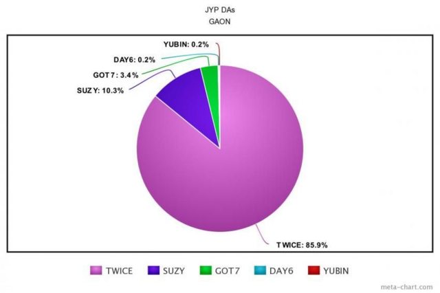 首先先從排名的第四名公司公佈,那就是「JYP」啦!TWICE為目前JYP最活躍女團,去年回歸超多次的她們,行程可以說是滿檔,TWICE的音源成績從剛出道就一直好到現在喔!加上專輯銷售也一點不輸男團,每次只要一回歸音源排行總是第一可不是假的,在五組同家藝人的情況下,音源比例佔重85.9%。