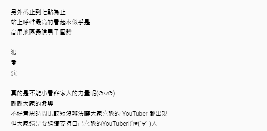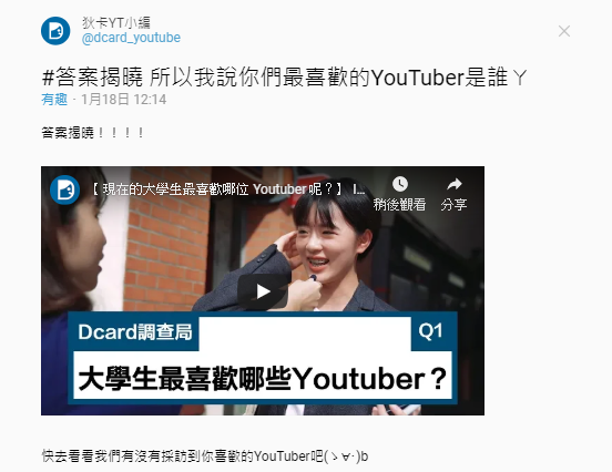 最後Dcard小編也公布在截止前呼聲最高的便是「狠愛演」,可謂是眾望所歸。事實上狠愛演現在的訂閱數40萬,在台灣YouTuber當中並不算特別突出,不過也因為他們具有個人特色的搞笑風格,成功打入大學生市場!