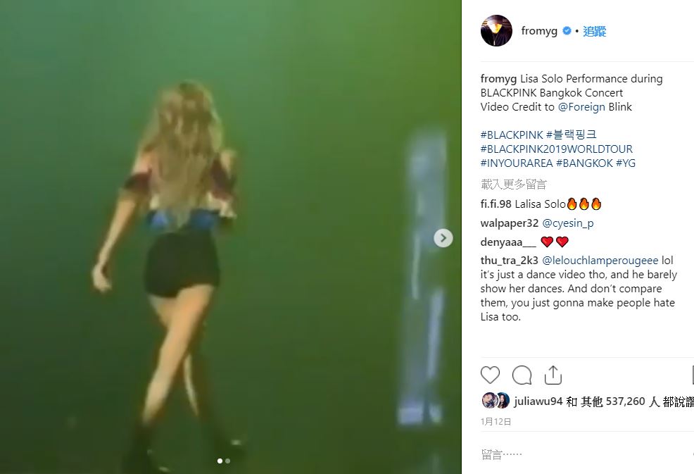 11日,BLACKPINK世界巡演在Lisa的家鄉泰國曼谷展開為期3天的演出,而當晚Lisa個人演出Jason DeRulo和性感饒舌歌后Nicki Minaj的合作曲《Swalla》,精采演出就連社長梁鉉錫也轉發個人IG,而在各個飯拍的影片中,幾乎都有突破百萬觀看次。