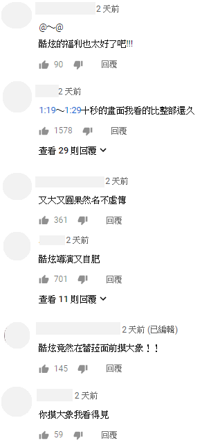 有趣的是後來兩人話鋒一轉,直接進入業配主題,才讓許多粉絲恍然大悟,而這次的小短劇,也讓許多網友留言:「酷炫的福利也太好了吧!!!」、「又大又圓果然名不虛傳」、「導演,真好」、「酷炫導演又自肥」、「酷炫竟然在蕾菈面前摸大象!!」