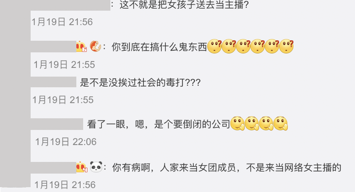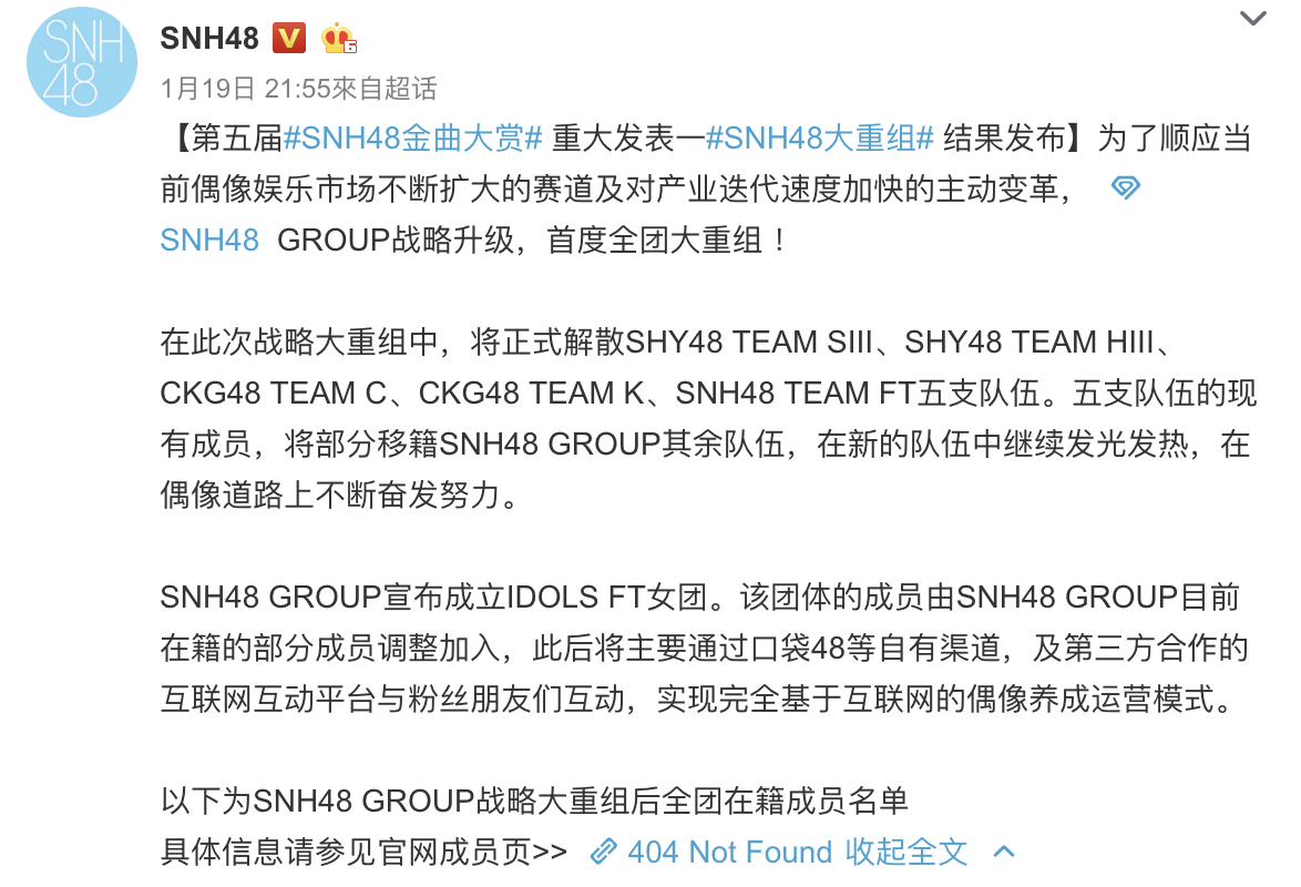 然而,在這次SNH48金曲大賞中,官方也宣布總共五個姐妹團將解散,並將一些團員移到其他團體當中,消息一出後就有許多粉絲認為此舉是將這些團員降級,並非常不滿的說道:「你有病啊,人家來當女團成員,不是來當網絡女主播的」、「你到底在搞什麼鬼東西」、「是不是沒挨過社會的毒打?」、「這不就是把女孩子送去當主播?」、「看了一眼,嗯,是個要倒閉的公司」,但也有粉絲認為團體中太多人導致非常沒有記憶點,並支持公司此舉,說道:「不知道搞這些亂七八糟的團體乾嘛,一個人都記不住,一般一個團體三四個人最好,這點都不知道?」