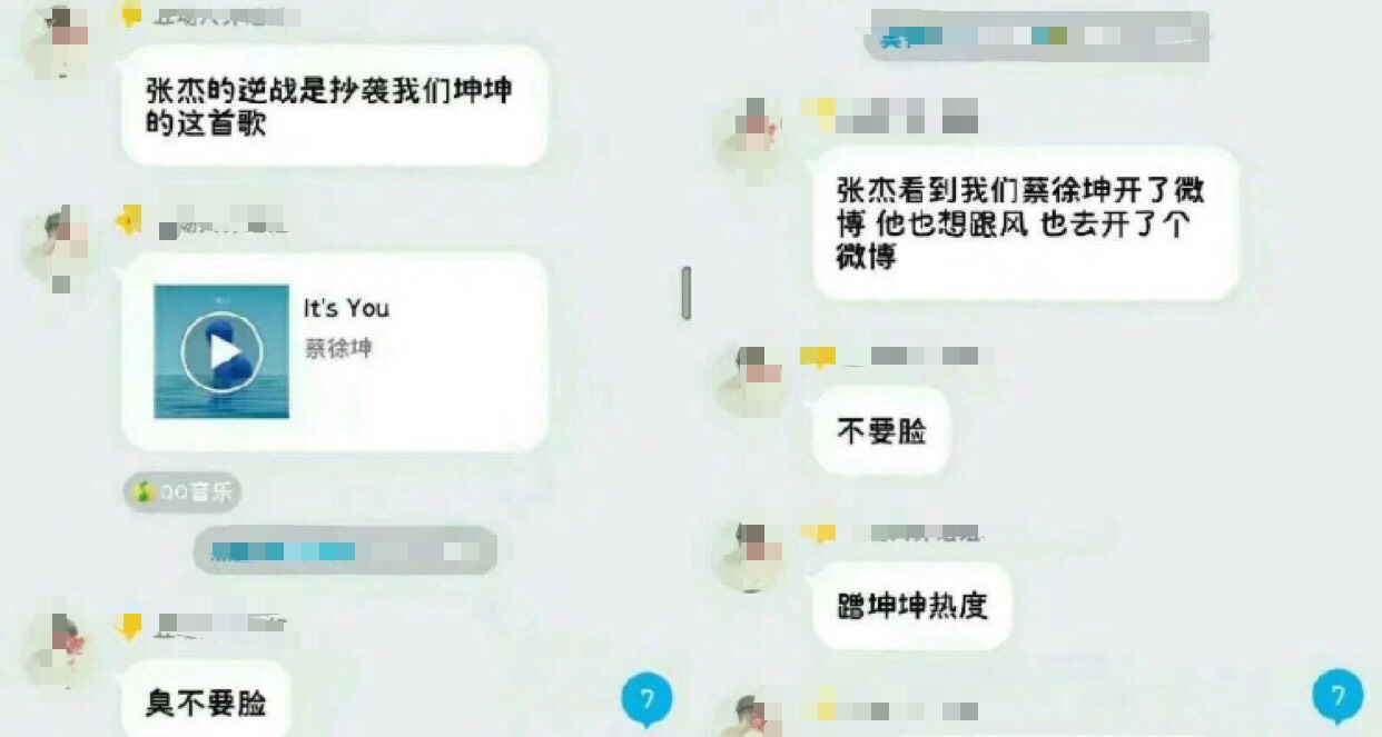 日前,有粉絲在微博上發出蔡徐坤粉絲群組內的對話紀錄,在對話中蔡徐坤的粉絲說歌手「張杰」的歌曲《逆戰》,是抄襲蔡徐坤的歌曲《it’s you》,更直呼張杰是「臭不要臉」,事實上逆戰這首歌早在2012年時就已發佈,當時作為槍戰遊戲的主題曲。而蔡徐坤的歌曲《it’s you》在2018年時才發布,如此說法也讓張杰的粉絲非常傻眼。