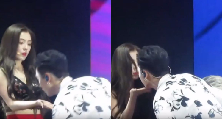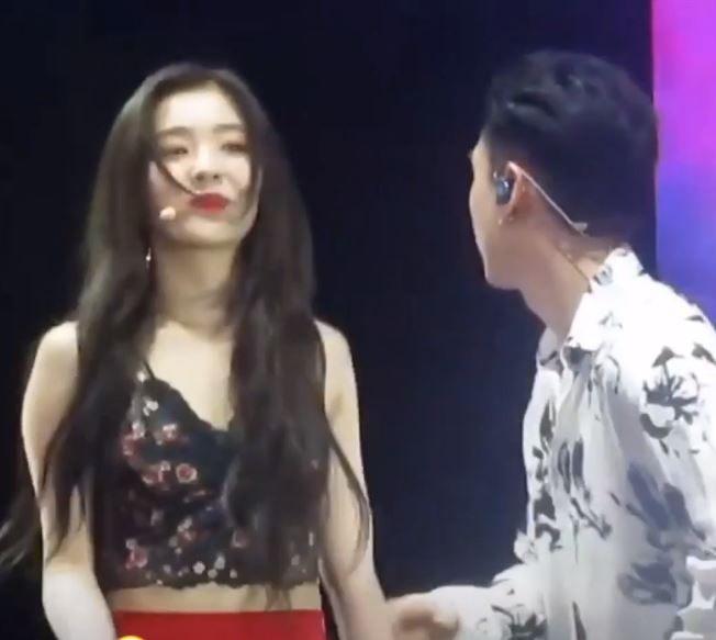 當天Irene穿著也以亮紅色喇叭搭配短版、細肩帶的背心,過程中不斷和師兄貼身熱舞,讓現場粉絲數度陷入瘋狂,然而就有粉絲捕捉到,Irene和SJ成員銀赫共舞時,Irene一個Wave差點就要在舞台上和銀赫嘴對嘴,幸好Irene反應快即時停住上半身,不過因為實在太尷尬,Irene隨著舞步離開銀赫時,仍然忍不住害羞而嘴角抽動。
