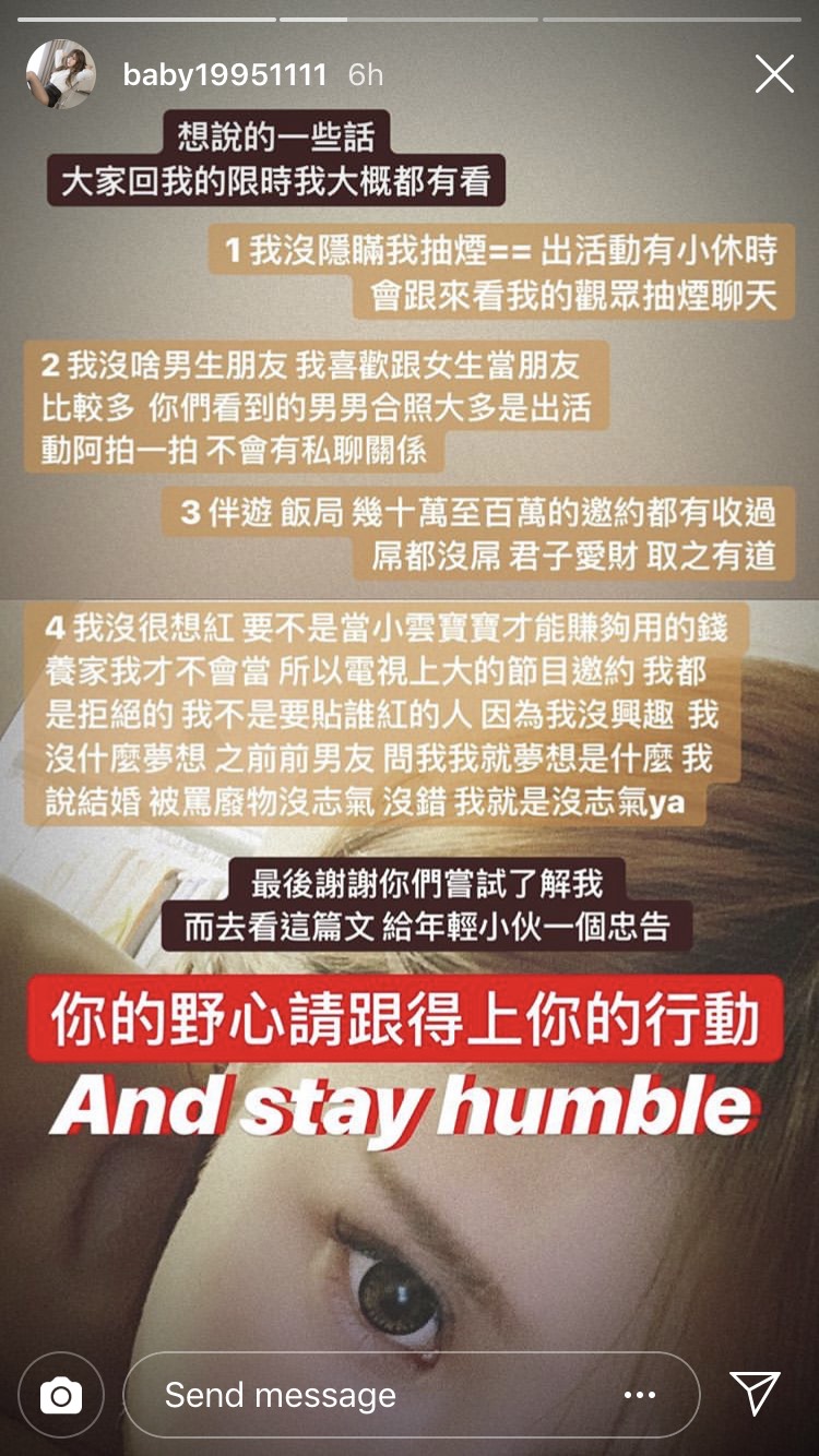 小雲寶寶昨(21)日在IG限時動態中發文,也列點回應一直以來許多網友對他的質疑!小雲寶寶首先表示自己確實有抽菸,更提到活動休息時都會跟粉絲抽菸聊天,她也說明其實自己沒有什麼男生朋友,IG中的合照大都是因為出席活動,「不會有私聊關係」。