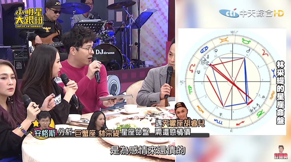 最後,星座專家安格斯針對林采緹的星座命盤做了一番分析,認為其命盤方正,會以家庭為依歸,但其中卻帶有一個落在天蠍座的缺口,而「胡睿兒」即是天蠍座,直言林采緹是為「感情來還債」,而且斷言之後可能還會有其他的小事件發生,令林采緹聽完神情複雜。