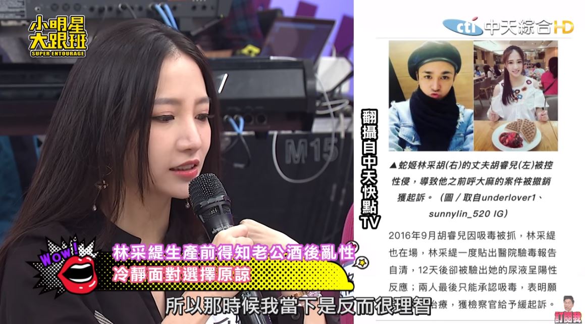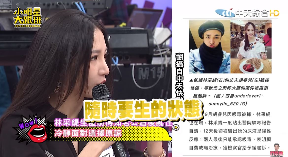 藝人林采緹過去以cosplay動漫航海王中的「蛇姬」波雅•漢考克而廣為人知,加上其亮麗的外型和火辣的身材,吸粉無數,在當時造成了一陣轟動。近年來林采緹卻飽受負面新聞的影響,2016年9月時與男友「胡睿兒」吸食大麻被捕、2018年7月又爆出男友背著即將臨盆的她,在外面亂搞,發生疑似撿屍性侵的醜聞,近日林采緹重回螢光幕前,在《小明星大跟班》談起這段心路歷程。