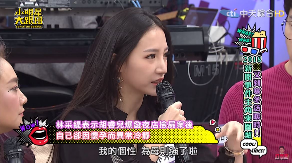 接著,林采緹也在節目中提及了「胡睿兒撿屍一案」,直言自己早在事件發生當天就已經知道,因當天便有警察來找胡睿兒,胡睿兒深知紙包不住火,便向她坦承了自己在夜店酒後亂性之事,但也同時強調雙方是「你情我願」。由於當時林采緹處在隨時都有可能臨盆的狀態,身心的壓力使她當場崩潰大哭,不過或許是因為母則強的心態,讓她在事發後的隔天,便恢復正常,表現得相當冷靜。