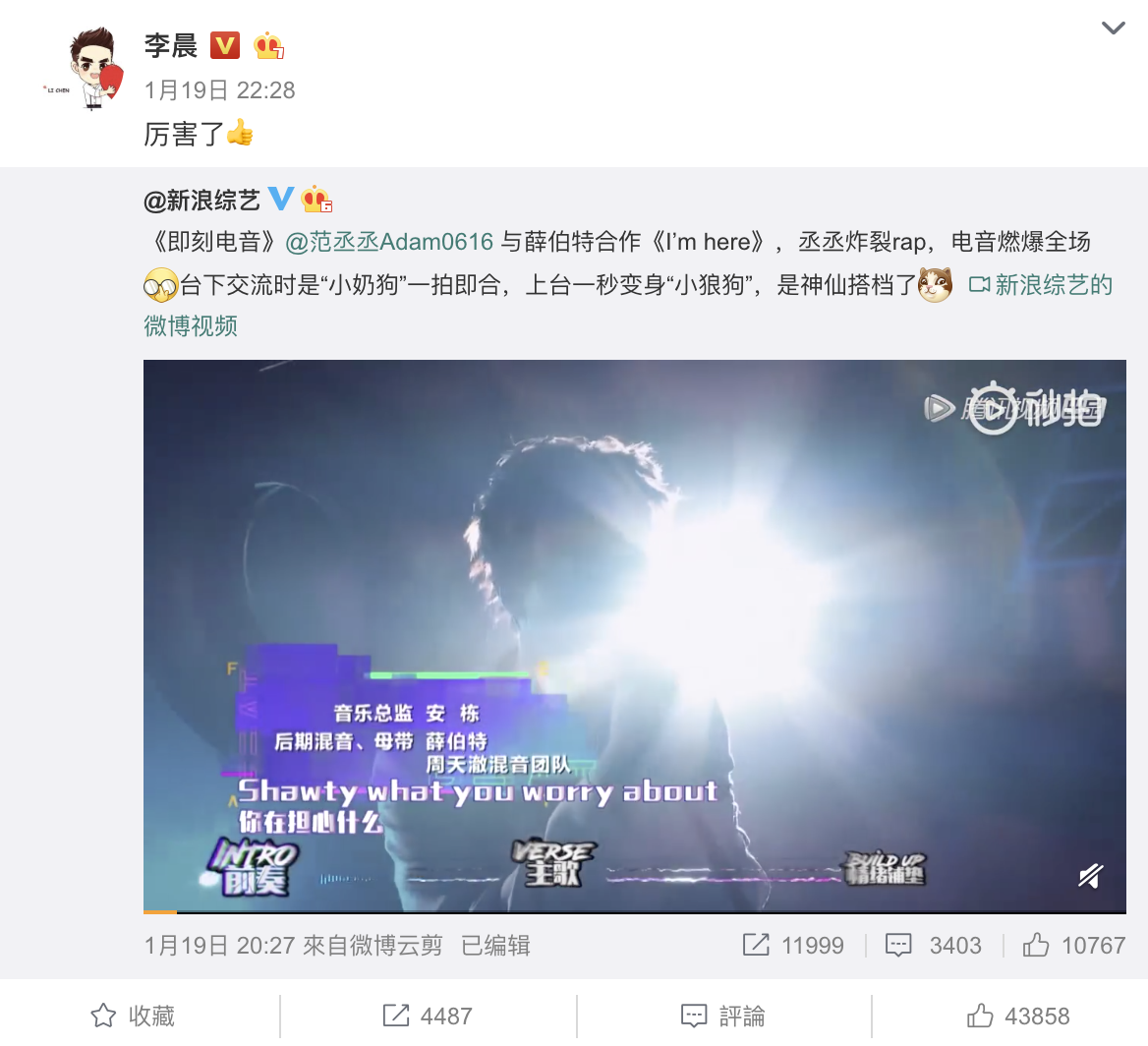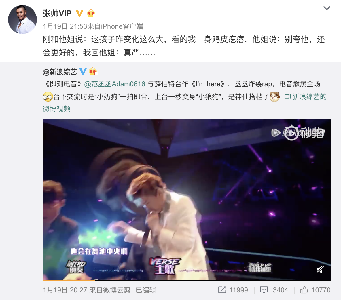 有一名知名服裝設計師「張帥」在微博上轉發范丞丞表演的影片,並寫下:「剛和他姐說:這孩子咋變化這麼大,看的我一身雞皮疙瘩,他姐說:『別誇他,還會更好的』,我回他姐:『真嚴……』」,這也是范冰冰自逃稅風波後,少數在社群上的消息,而范冰冰的男友「李晨」也親自轉發影片,並說:「厲害了」,讓粉絲們都非常的興奮。