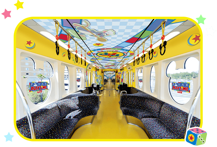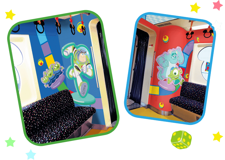 活動期間迪士尼也推出「限定皮克斯列車」,一走進車廂就被繽紛的色彩給吸引住,彩色點點的座椅配上充滿卡通人物的天花板,讓人好想回到童年啊!而且每個車廂出現的卡通人物和主題都不一樣,看來要拍完每一節車廂,要來回搭個十趟才行啊!