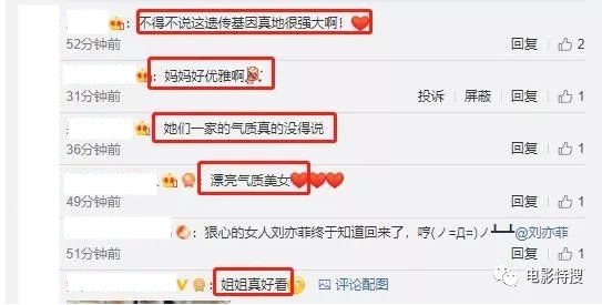 但站在一旁的劉亦菲媽媽更是搶眼,身穿綠色大衣,搭配淺色墨鏡,全身散發出高雅溫柔的氣質,讓網友們看到後紛紛表示「簡直美到哭泣!」、「媽媽好優雅」、「表白劉媽媽」、「簡直比劉亦菲還搶鏡」、「他們一家的氣質真是沒話說」、「神仙母女同框了」讚嘆劉亦菲媽媽的美貌氣質。