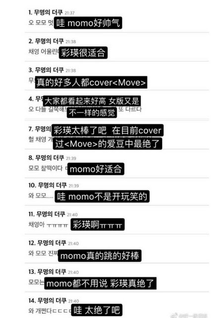 19日,TWICE中4位成員包括彩瑛、Mina、Momo和多賢,一同演出SHINee泰民的SOLO歌曲《MOVE》,該首歌曲節奏雖然不快,不過復古和R&B的曲風深富節奏感。當天,4位成員舞台裝扮一致黑色造型,突破在TWICE中活潑的印象,大膽展現酷帥兼具性感的演出,舞蹈編排呈現不少肢體的延展,此外,時常在平靜的動作中又突然加重力道和速度,反差之下反而製造很大的張力。