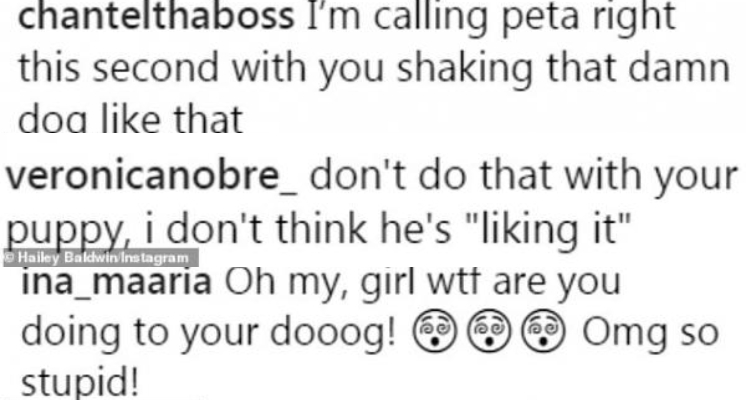 ▼網友留言批評:「狗不是玩具好嗎,海莉!」、「請不要虐待狗」、「如果你再這樣甩狗我會通知動保協會」等等言論,可見粉絲們都相當擔心並且不贊同海莉鮑德溫(Hailey Baldwin)的做法。