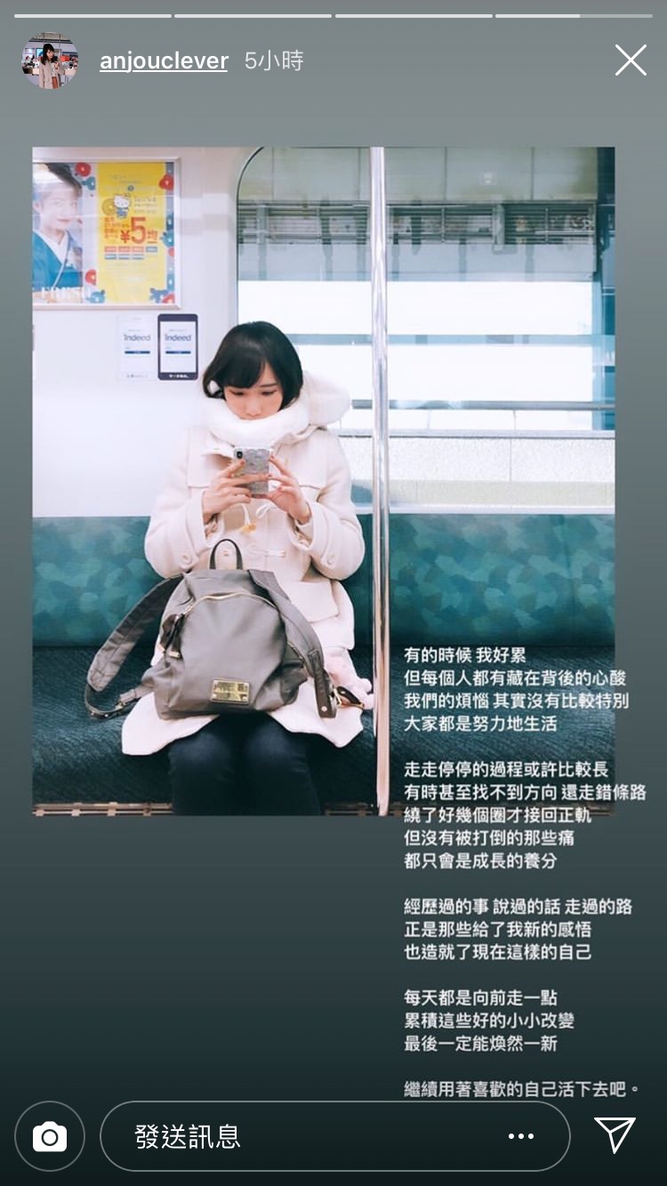 安啾昨(22)日在IG限時動態中發文:「有的時候,我好累」,不過雖然讓大家看見自己比較負面的一面,她卻也表示:「每個人都有藏在背後的心酸,我們的煩惱,其實沒有比較特別,大家都是努力地生活」,安啾說明自己在生涯中走走停停,有時還會找不到方向、走錯路,「繞了好幾圈才接回正軌」,可是這些痛最後都會變成成長的養分。
