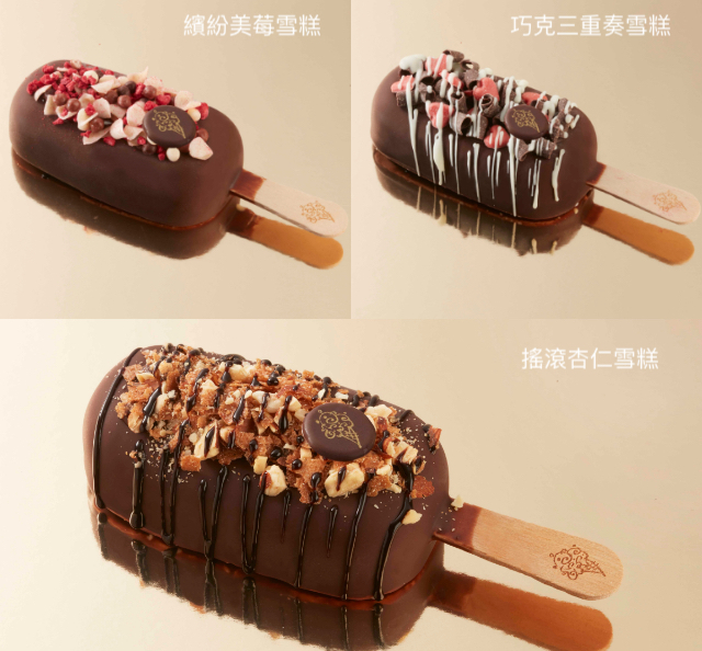 除了自創雪糕,COLD STONE還研發了3款超人氣推薦款:「繽紛美莓雪糕」、「搖滾杏仁雪糕」、「巧克三重奏雪糕」,一樣是以法式玫瑰鹽香草冰淇淋為基底,不過分別灑上覆盆莓碎粒、巧克力脆球、烤杏仁、可可巴瑞脆片、巧克力醬、愛心巧克力、黑巧克力葉等不同的配料。3款的價格都是120元喲~