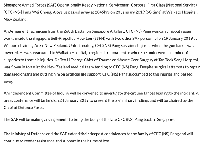 馮偉衷於1月初前往紐西蘭懷烏魯的訓練區參加代號「霹靂戰士」(Thunder Warrior)的軍事演習,並在維修155毫米榴彈炮車時被意外壓傷胸腹,之後在意識清醒的狀態下,被直升機送往懷卡托醫院。儘管外科手術試圖修復受損器官,但和死神搏鬥4天後宣告重傷不治,於新加坡時間2019年1月23日晚上8時45分死亡,得年28歲。