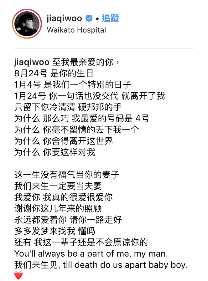 去年在電視劇《229明天見》飾演他母親的「葉全真」得知噩耗後,隨即也在臉書難過地發文悼念:「天使,謝謝你來走了一遭,留下了屬於 真 善 與 美 的樣貌,你曾説過去的國家不多,帶著你的微笑 展開你的翅膀,翱翔吧!」,而馮偉衷的女友「胡佳琪」也在IG上沉痛的發文悼念,也約定「這一生沒有福氣當你的妻子 我們來生一定要當夫妻」,兩人過去戀情為非公開的狀態,而如今卻天人永隔,讓胡佳琪悲傷不已。